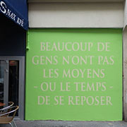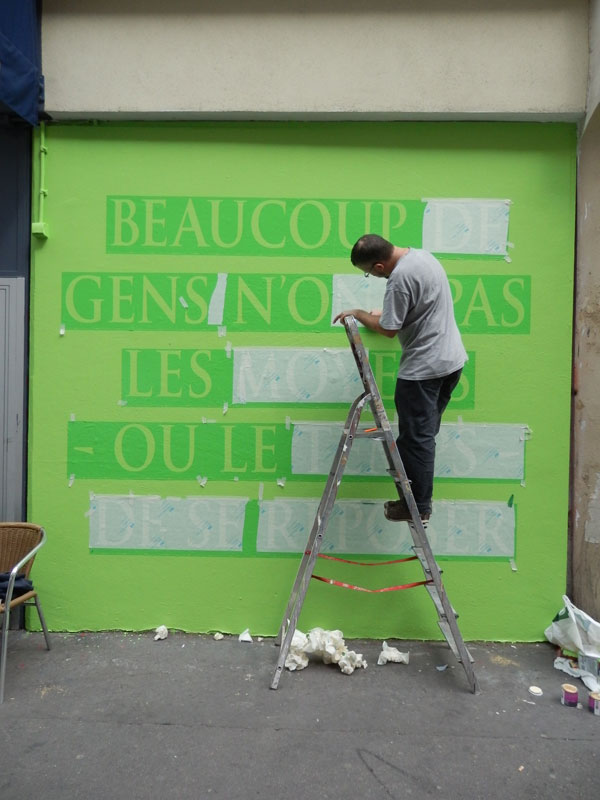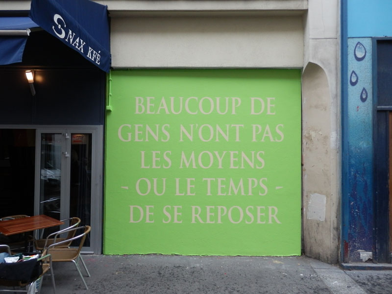 La pertinence de la phrase s'éclaire au regard de la vie actuelle et de son caractère effréné, axé sur la productivité – même dans le cadre d'une démarche artistique! La phrase prenait tout son sens dans le contexte de la difficile situation socio-économique qui perdurait en France. Or on sait depuis longtemps que la productivité est accrue lorsque le corps et l'esprit sont rafraîchis, d'où l'importance du repos et du loisir. De plus, les passants devaient s'arrêter pendant quelques instants pour lire la phrase : une brève pause, inspiratrice peut-être d'un repos davantage prémédité. Le mur saint martin est attenant à la terrasse d'un café, ce qui contribue à cet appel à la décélération. Par son caractère anonyme, cette inscription dans l'espace public constitue une forme d'action furtive.