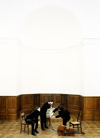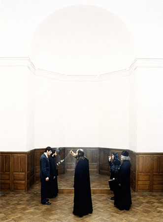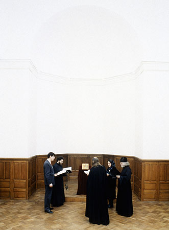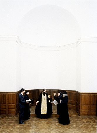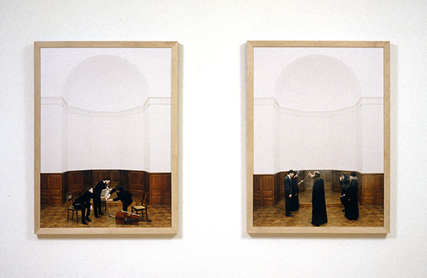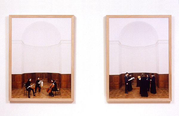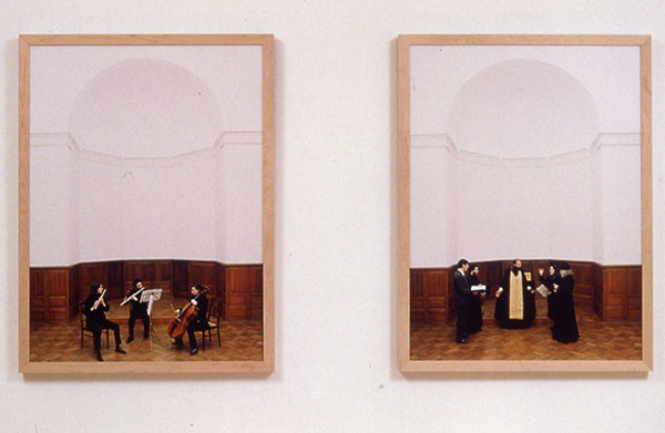 Chaque diptyque réunit deux moments parallèles des deux activités représentées, créant ainsi une nouvelle narrativité. Comme dans plusieurs de mes travaux visuels précédents, les images sont juxtaposées mais demeurent séparées par les encadrements et par l’espace blanc du mur entre les éléments, sorte de marge symbolique dans laquelle se joue le sens de l’œuvre. L’espace des photographies est lui-même divisé en deux, et les activités se déroulent dans le tiers inférieur, contre l’arrière-plan des boiseries. Rien n’interfère avec la blancheur des murs de l’abside et de la voûte, accentuant ainsi l’élan vers le haut. Le luxe d’espace soi-disant vide reflète l’immatérialité de la musique et de la prière, activités sonores dont la photographie ne conserve nulle trace.