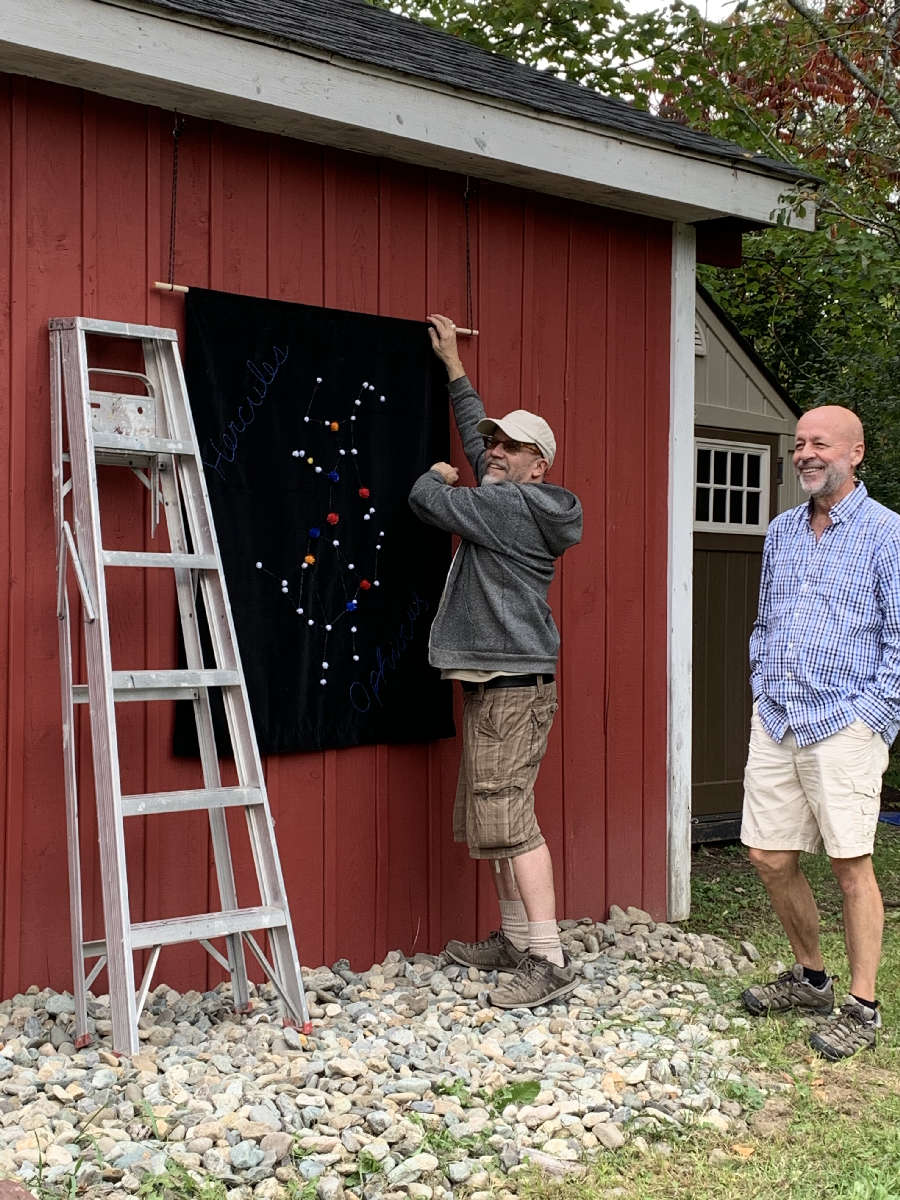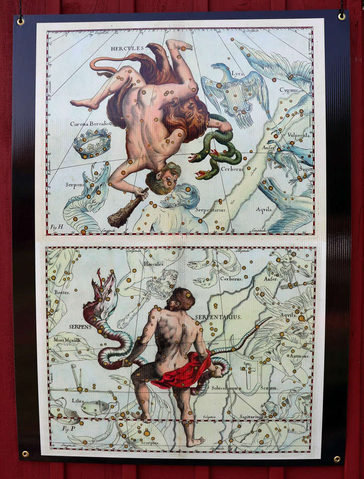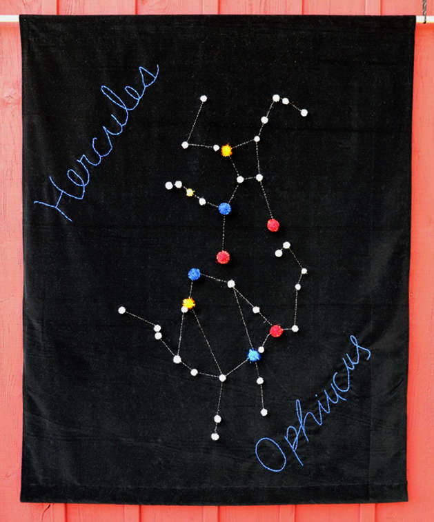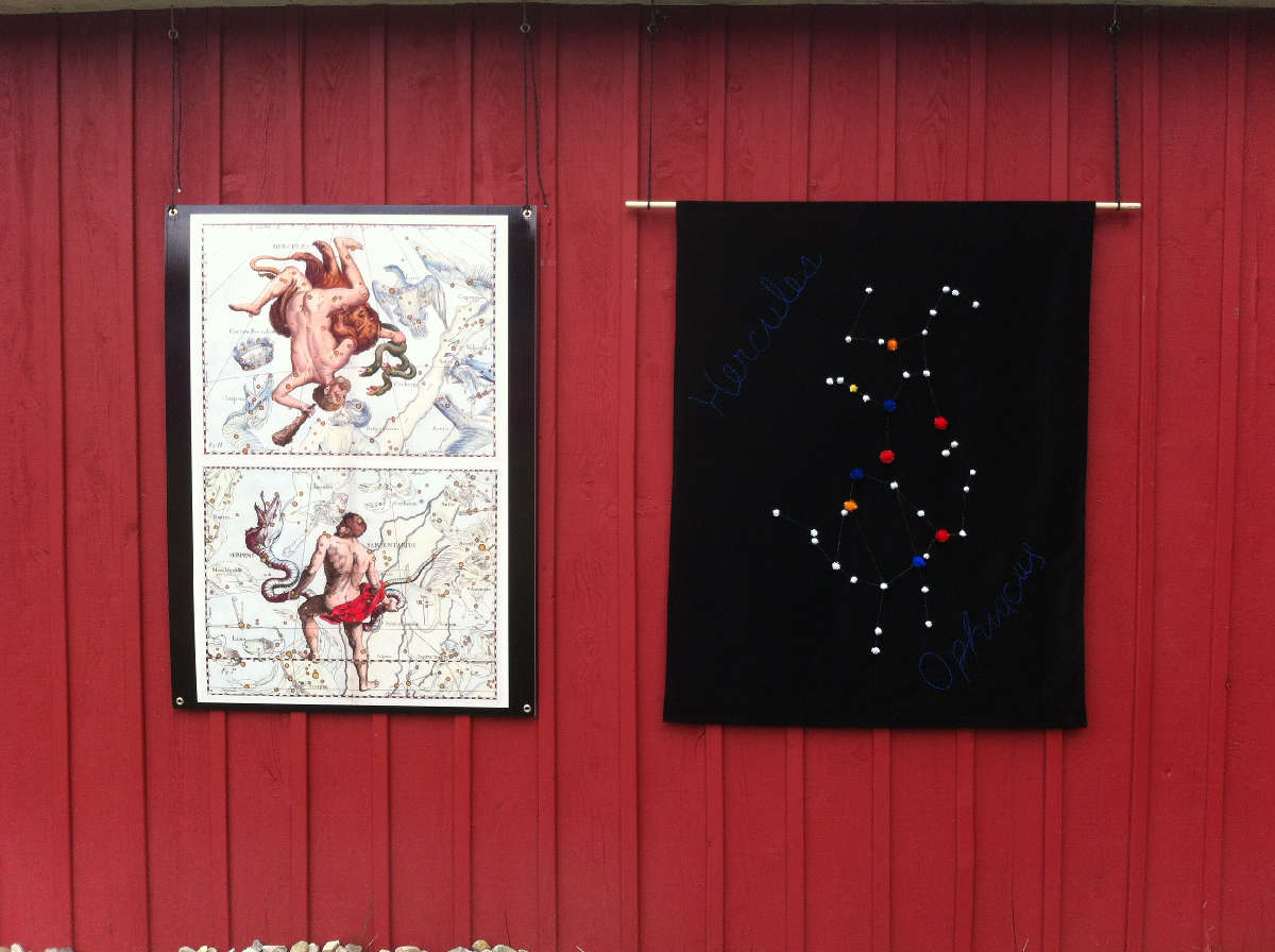Pour cette première collaboration, nous avons uni nos expériences en astronomie et en arts visuels. Nous avons exploré l'art textile pour évoquer deux constellations représentant des héros mythologiques placés en tête à tête dans le ciel, Hercule et Ophiucus, aussi appelé le Serpentaire. Les magnifiques planches anciennes qui offrent un pendant visuel à notre pièce brodée sont tirées de l'atlas Uranographia, dessiné et publié par l'astronome polonais Johannes Hevelius en 1690.