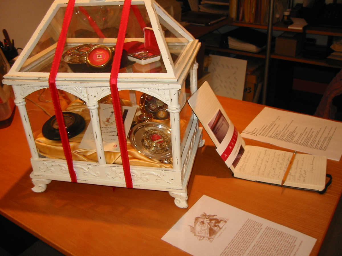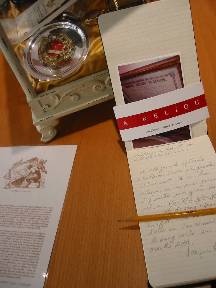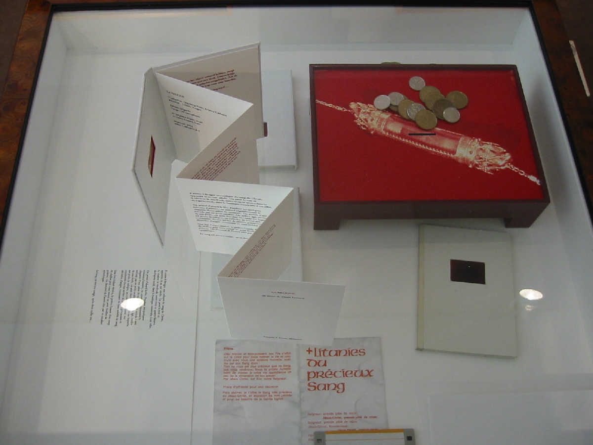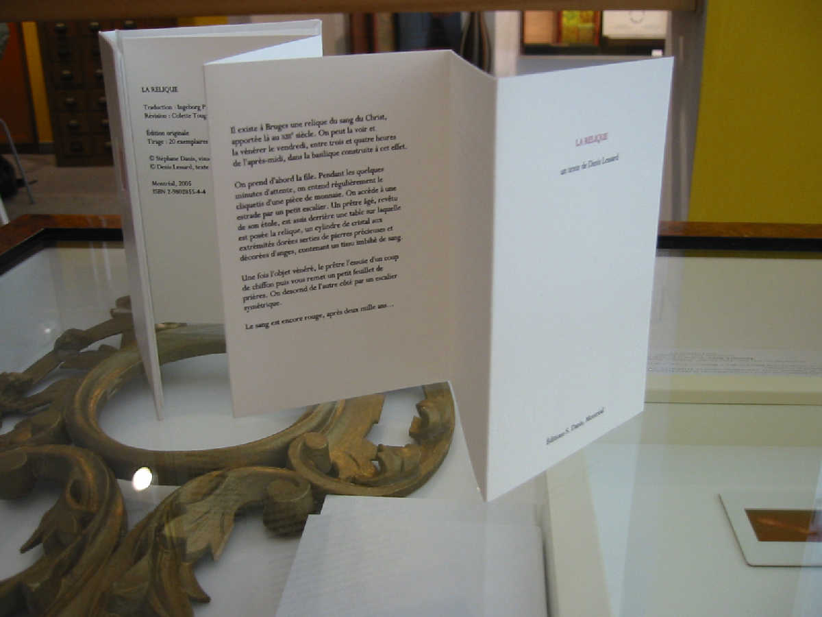 La Relique a débuté par la rencontre innatendue d'un texte et d'une photographie : un texte écrit par Denis Lessard à la suite d'une visite à la basilique du Précieux-Sang de Bruges, qui abrite une relique du sang du Christ ; une photographie du reliquaire, sous forme de diapositive rapportée par Stéphane Danis lors d'un pèlerinage similaire. Rougeoyante relique de l'ère de la photographie analogique conservée précieusement en attandant ...