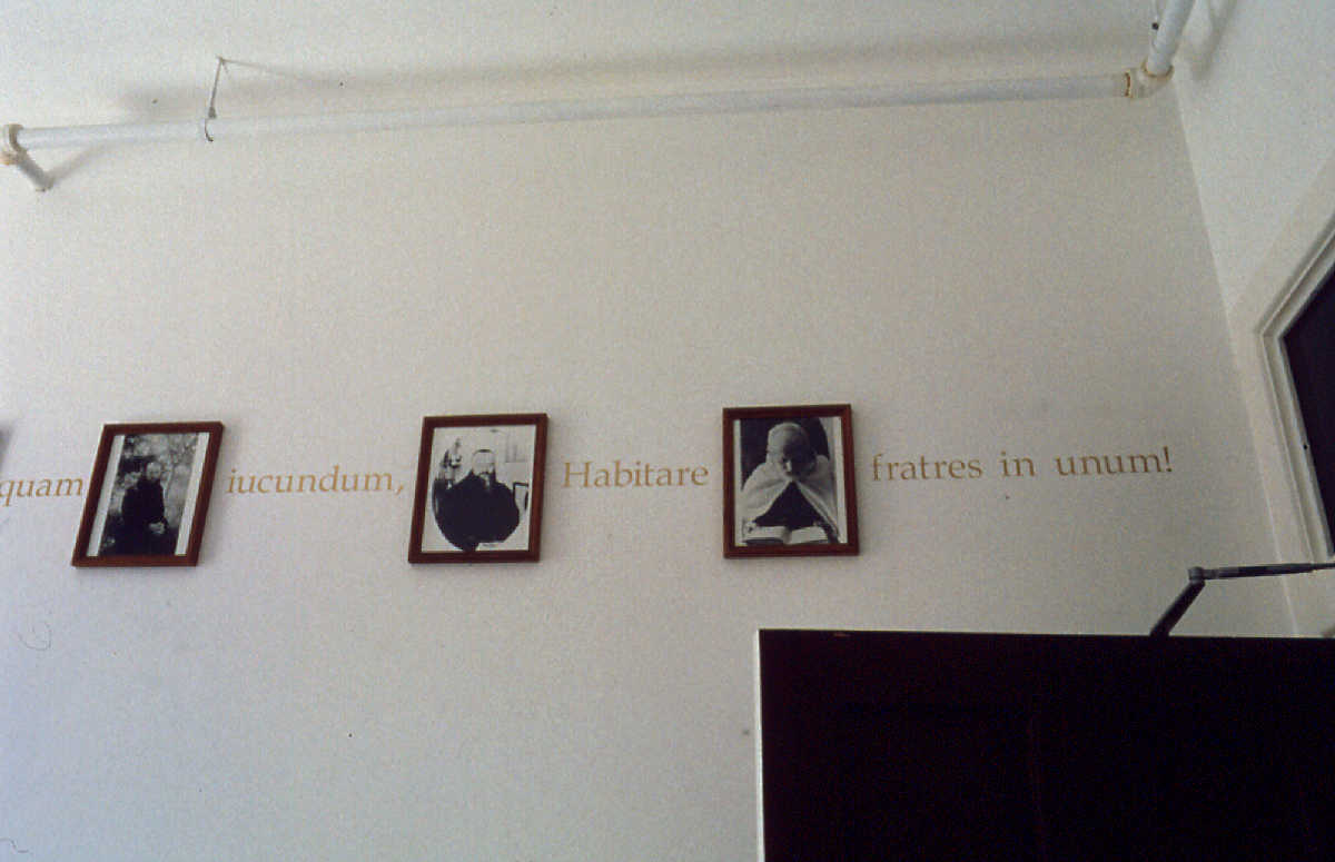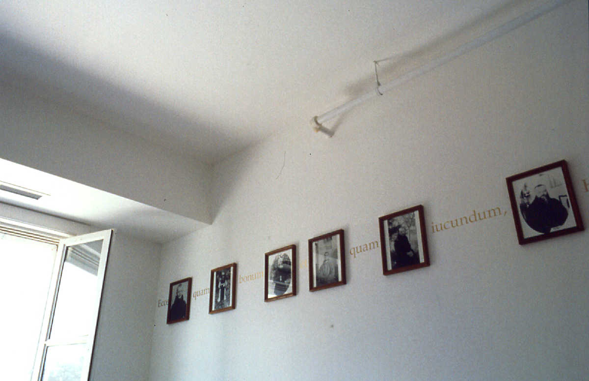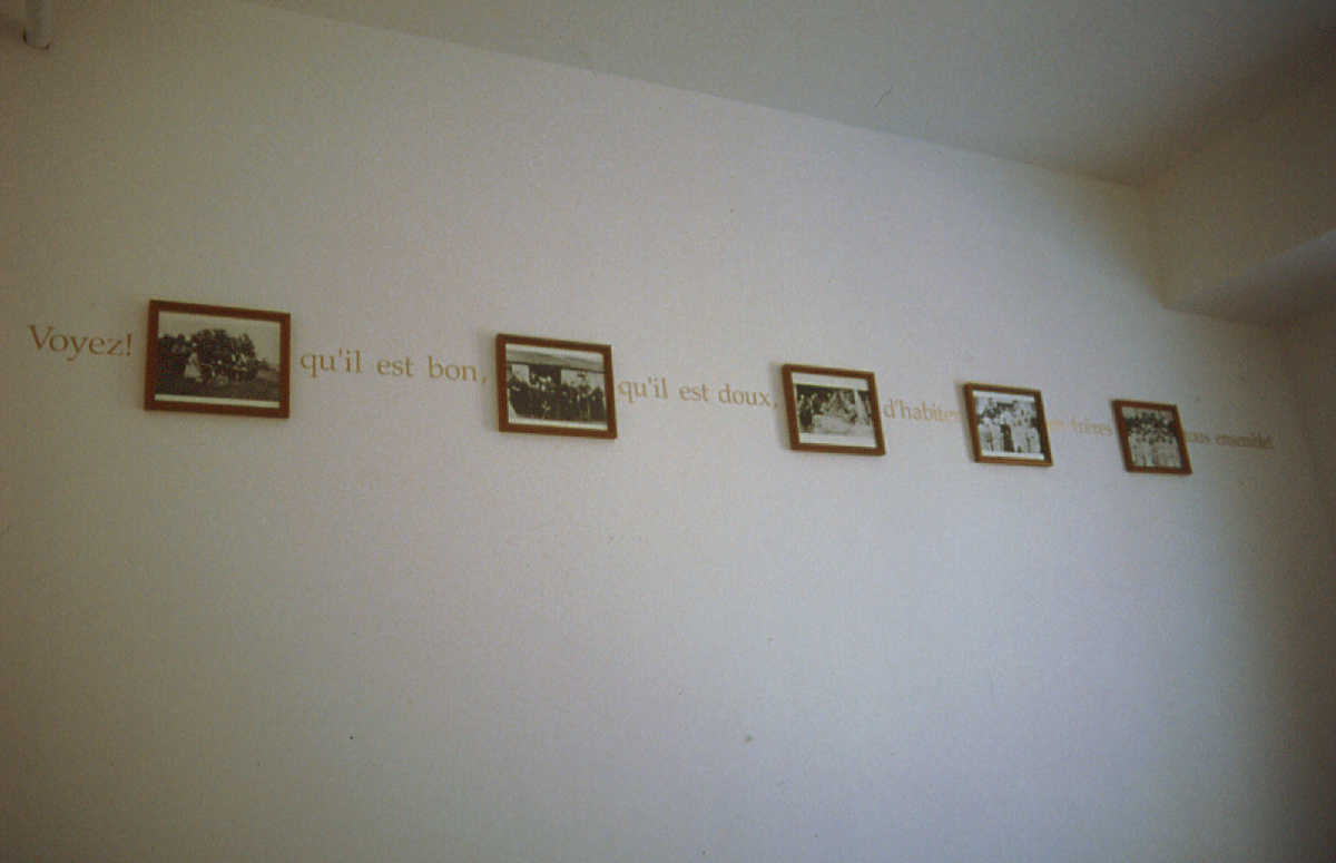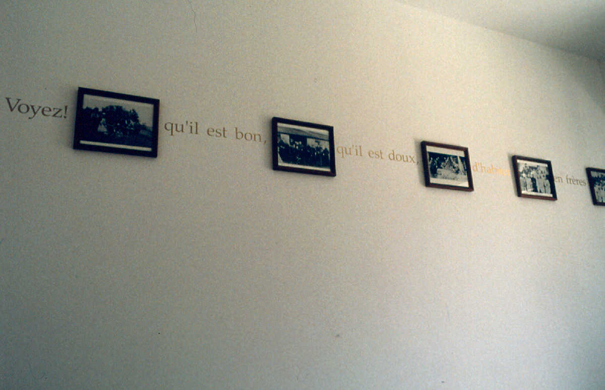 Désireux de préserver le lien entre le Centre des Arts de Saint-Norbert et sa vocation passée d'hôtellerie monastique attachée à l'ancienne abbaye trappiste de Notre-Dame-des-Prairies, je suis allé consulter les archives de la communauté établie à l'époque à Holland, Manitoba, à compter de 1978. J'ai passé trois jours au nouveau monastère, suivant les offices de prière des moines et cherchant des photographies anciennes qui pourraient exprimer l'idéal de vie fraternelle proposé par le premier verset du psaume 133, qui est utilisé dans l'installation « La vie fraternelle » réalisée dans le cadre de la résidence « Language Hotel » en décembre 2000. Le texte du psaume est en français et en latin, qui constituaient les deux langues utilisées par la communauté trappiste de Saint-Norbert, formée à l'origine de moines en provenance de l'Abbaye de Bellefontaine en France, auxquels se sont joints des Canadiens-français. Le latin était la langue des offices religieux catholiques jusqu'au début des années 1960.