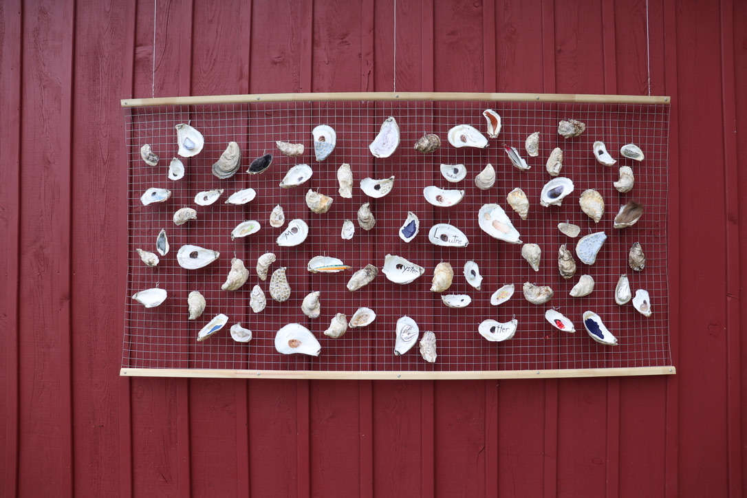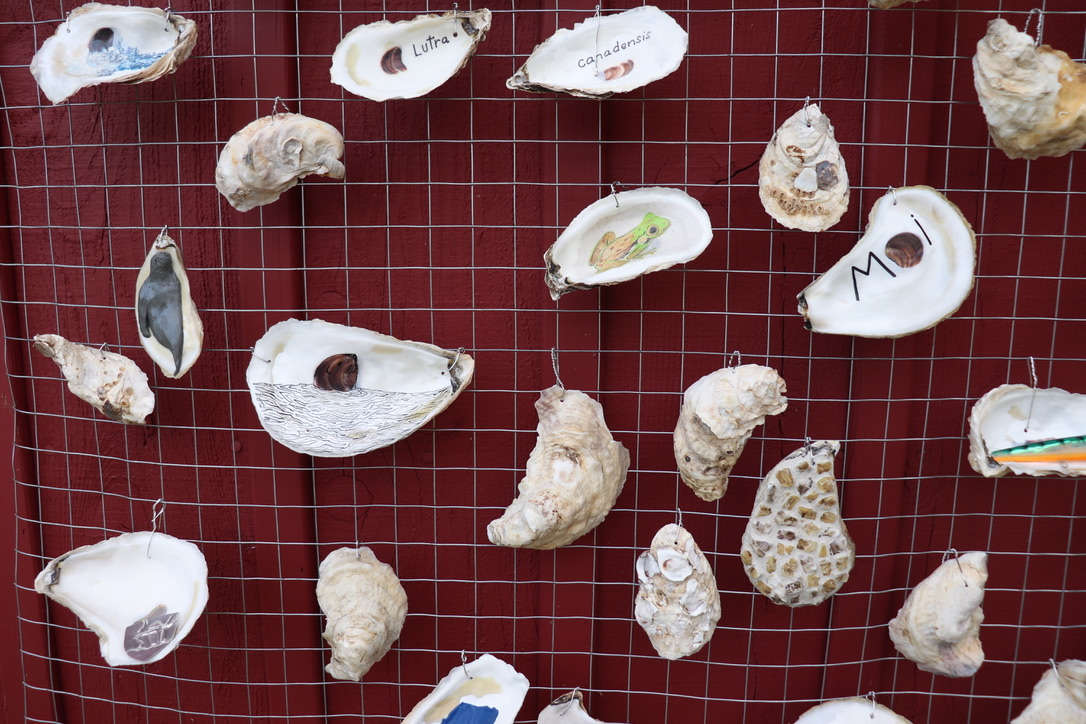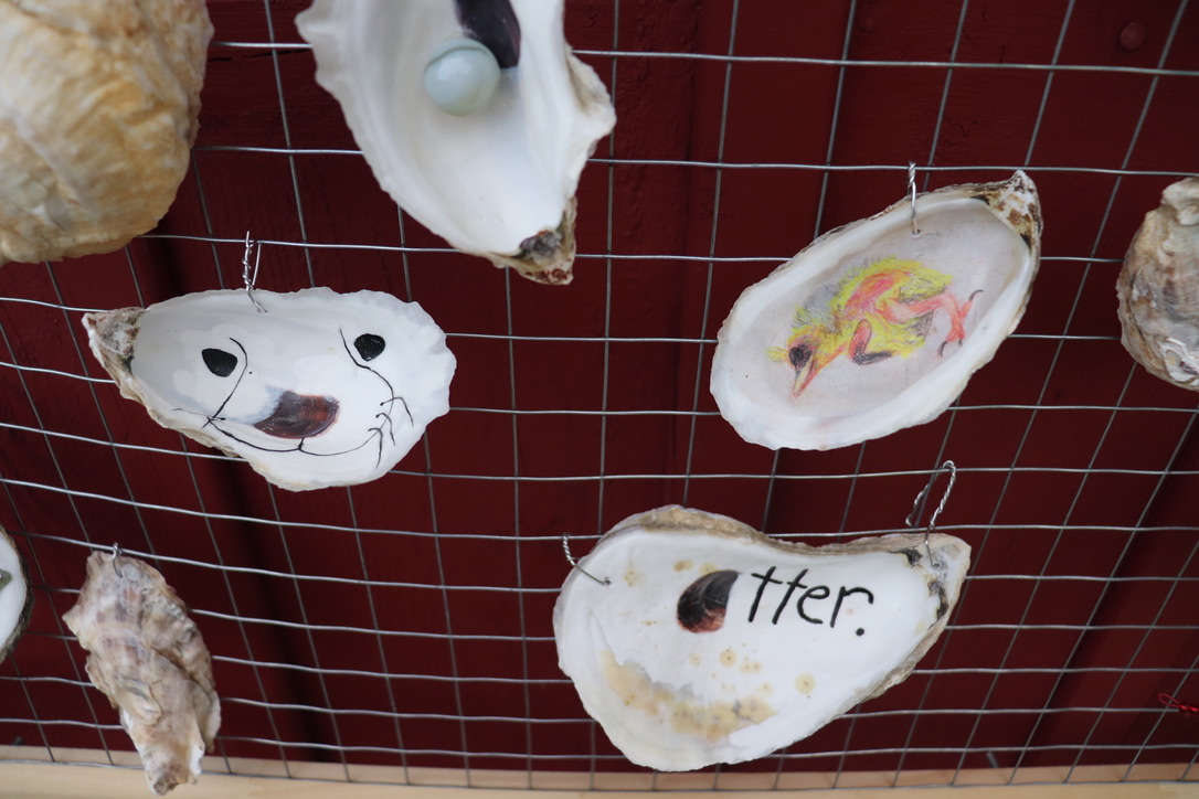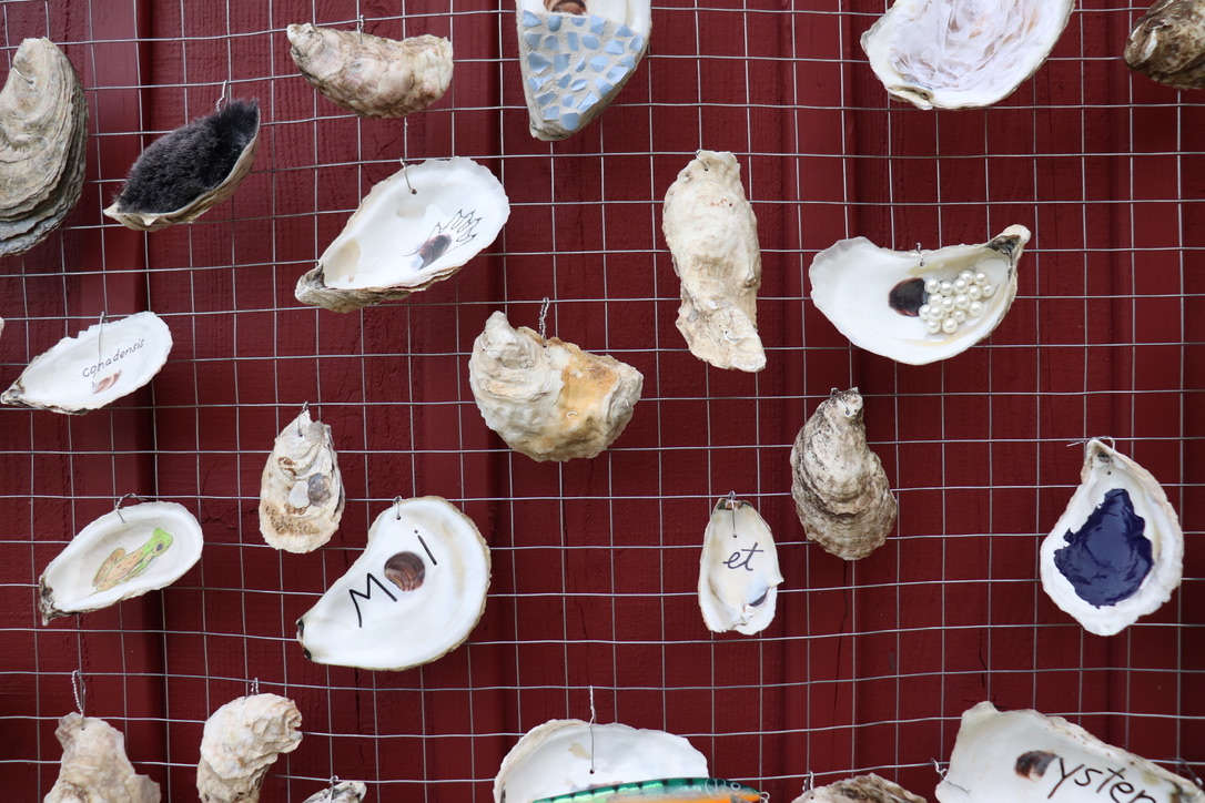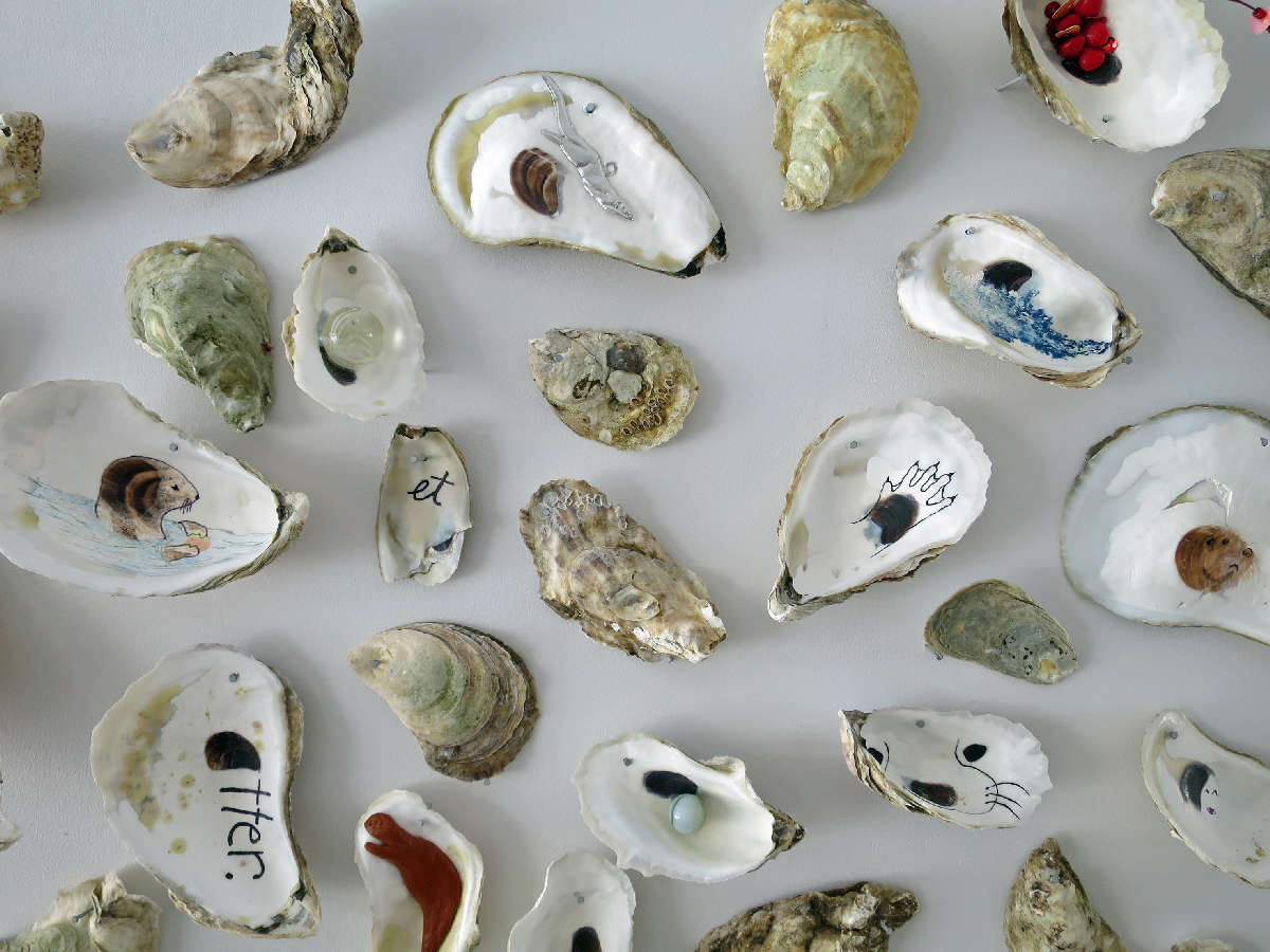 Coquilles d’huîtres avec interventions à l’encre de Chine, collages, métal repoussé, perles, paillettes, fourrure synthétique, billes, craies de cire, dessins, crayons, mosaïque, friandises, coquilles de moule et peinture acrylique.